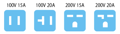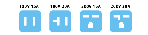 設置する機種の電源とコンセントの種類を下記の図を参考にご確認ください。場合によっては100vから200vへの変換が必要となりお見積もりが変わってまいります。